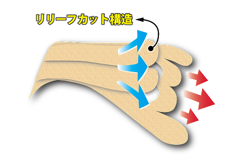 「リリーフカット」構造によりその力を面で受ける形となるため力が分散され、粘着力を過度に強くしなくても、はがれにくい。