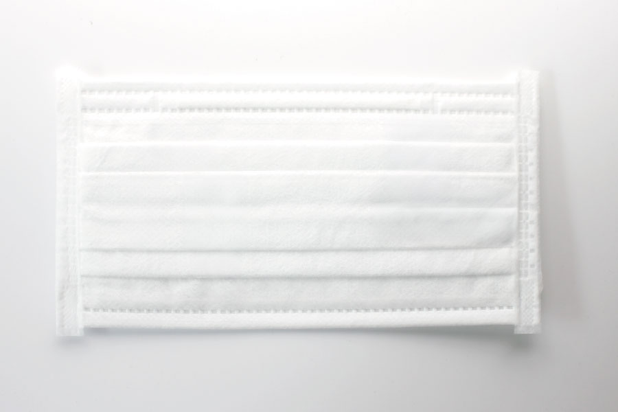 ①マスク上下の端を軽くつまみ、プリーツを広げててください。張り出した側が外側になります。