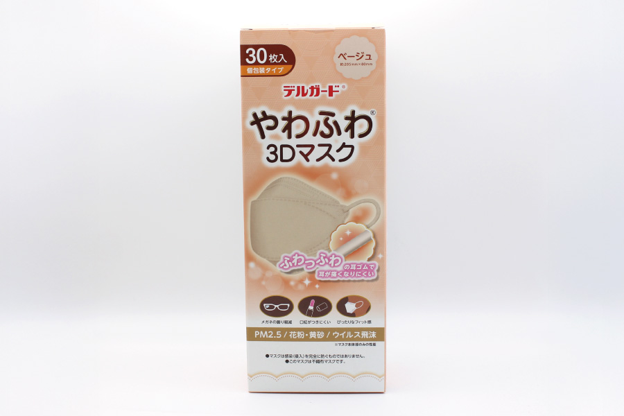 呼吸がしやすく、口紅がマスクにつきにくい口元空間形状でフェイスラインもスッキリ綺麗に。マスク内側(肌に当たる部分)により柔らかい不織布を採用しているので、優しい肌触りになっています。特殊な編み方の耳ゴムもやわらかく ふわふわなので、耳が痛くなりにくくなっています。ホワイト、ベージュ、グレーの3種類があります。