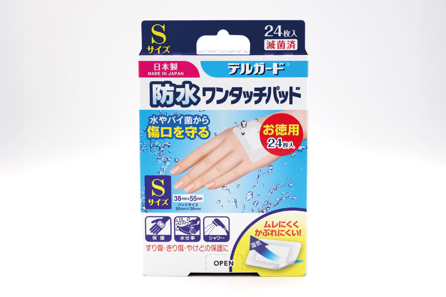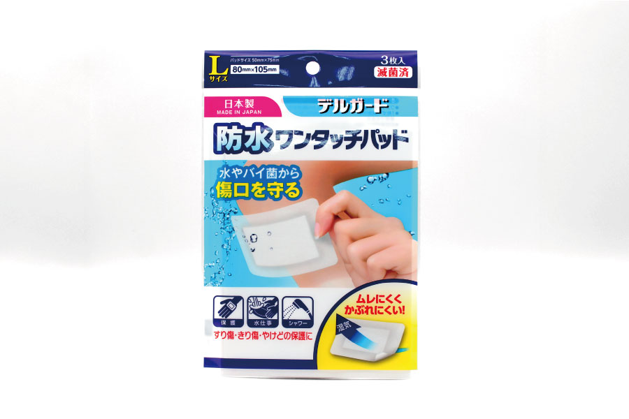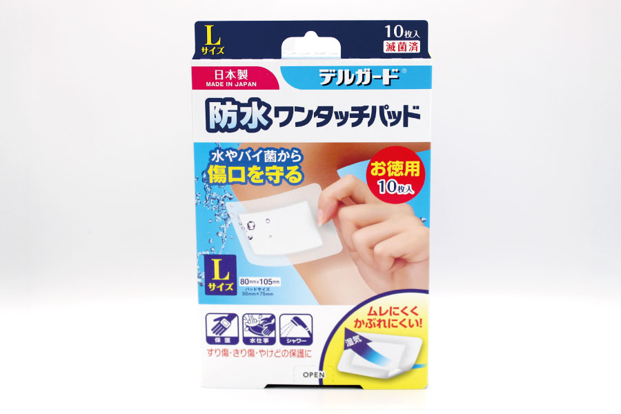 大きめのキズを、水やバイ菌からしっかり保護します。防水粘着シートと吸収力の高い医療用脱脂綿を組み合わせた防水タイプのワンタッチパッドです。