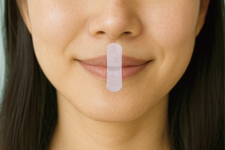 ⑤口を閉じ、テープの中心が唇の中央にくるように合わせて貼ってください。